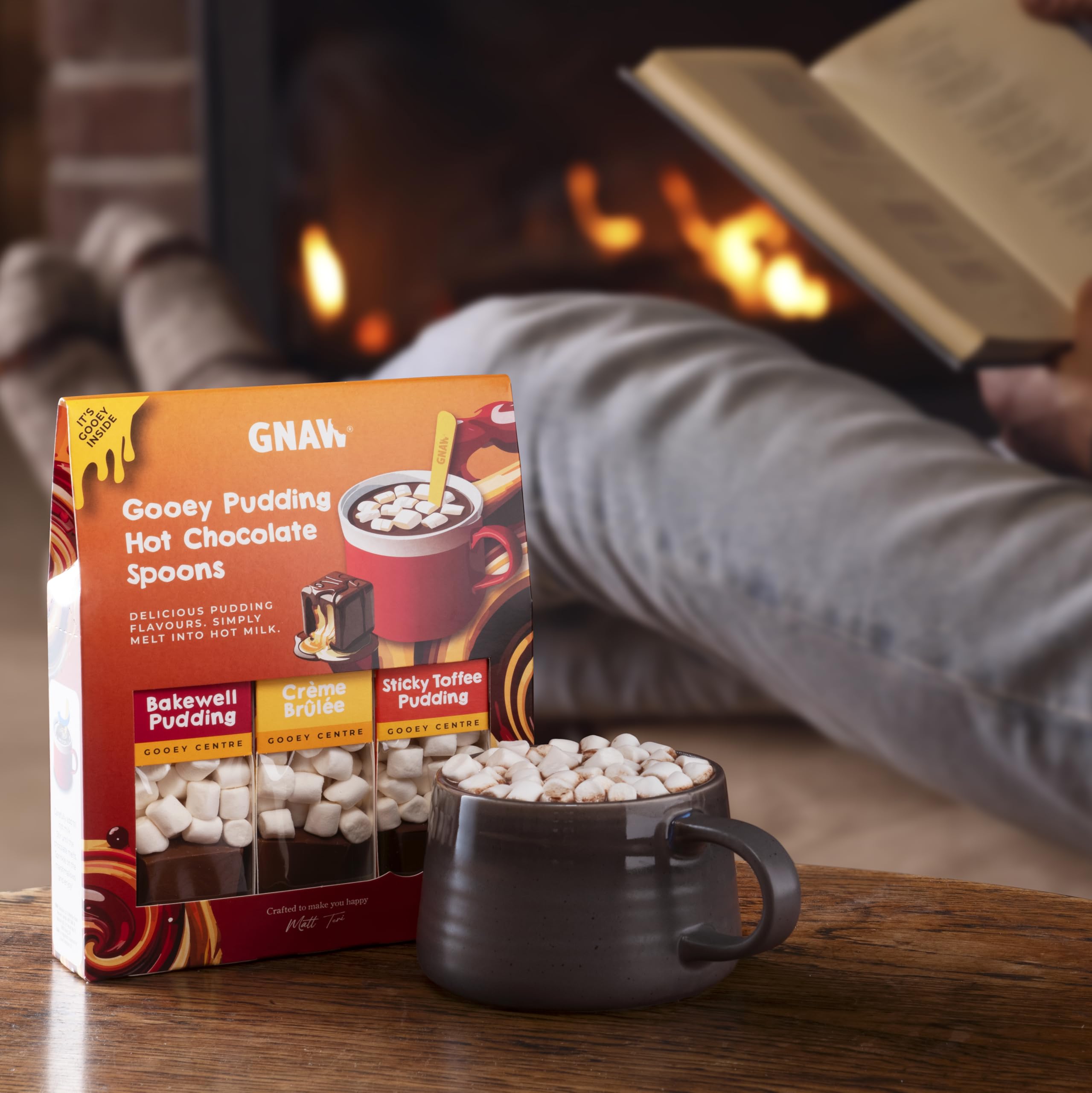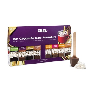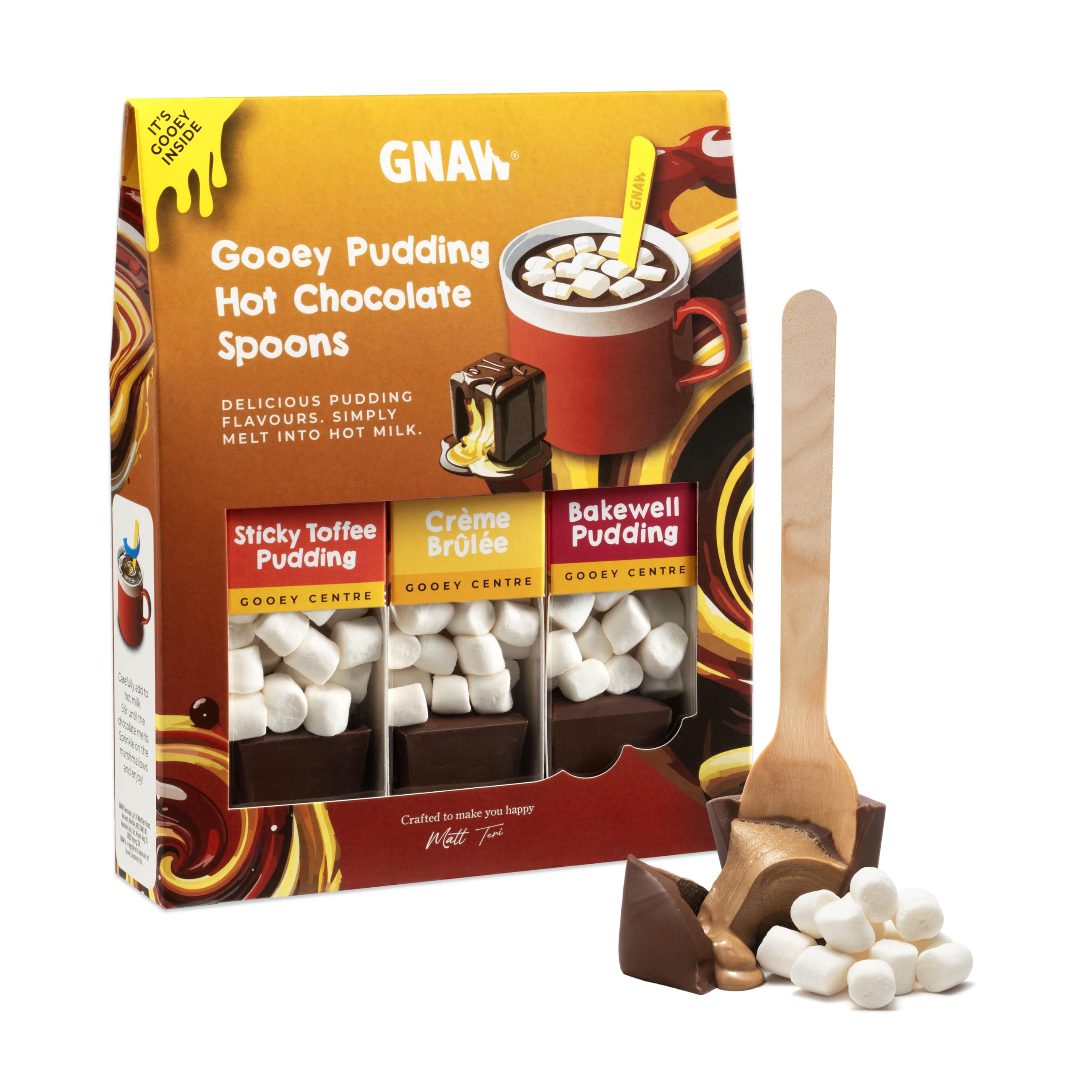 Gnaw Hot Chocolate Gift Set, Hot Chocolate Spoon Trio, Soft Centre Pudding Set, A Selection of Filled Milk Chocolate on Spoons with Marshmallows