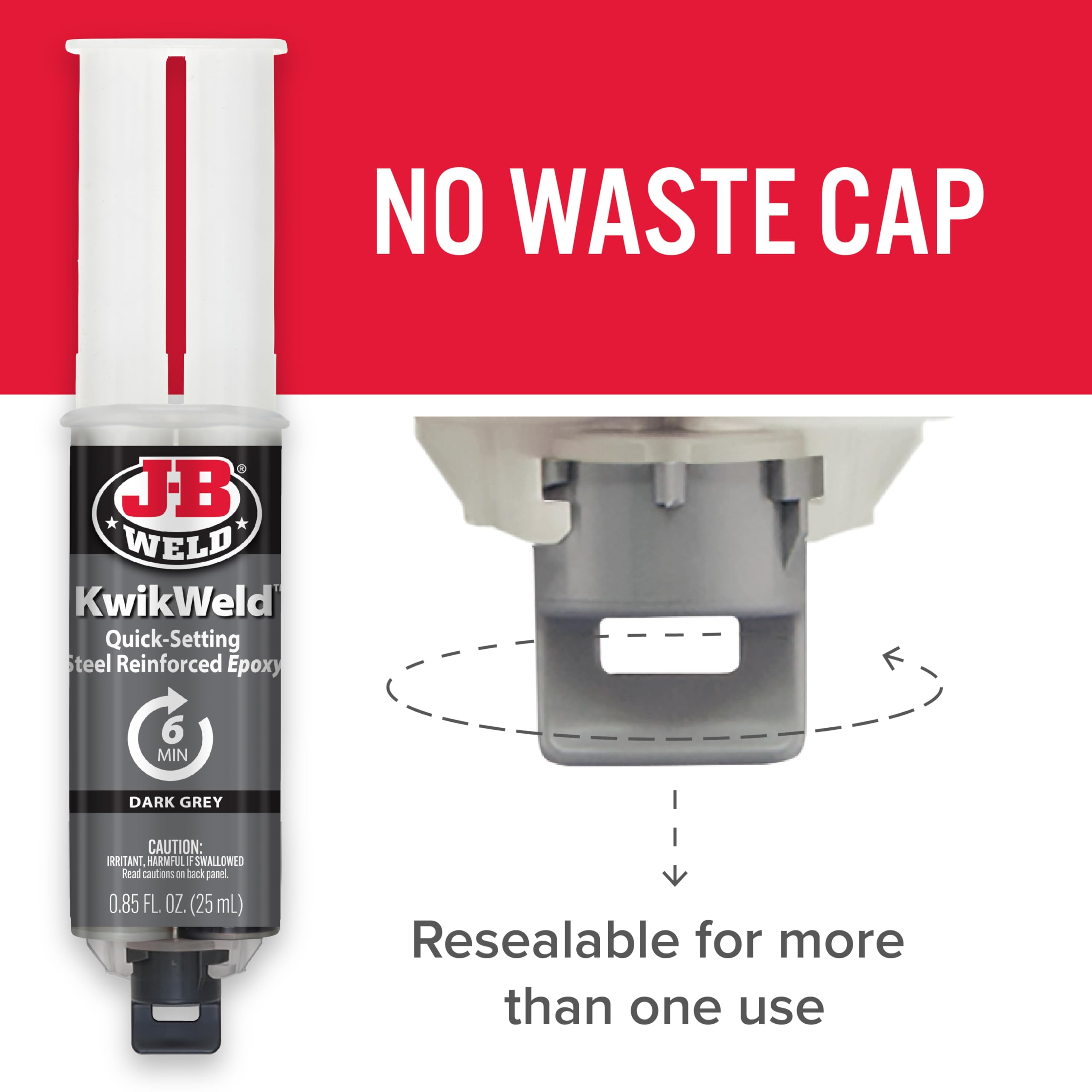 Details: Product Description KwikWeld is a fast-setting version of The Original J-B Weld two-part epoxy cold weld system that provides strong, lasting repairs to metal and multiple other surface types. After mixing, it forms a permanent bond and can be shaped, tapped, filed, sanded and drilled after curing. KwikWeld has a 1:1 mixing ratio, sets in 6 minutes and is fully cured in 4-6 hours. KwikWeld cures to a dark grey color, is rated at a tensile strength of 3127 PSI and will withstand temperatures up to 300ºF. Box Contains 1 x KwikWeld Epoxy