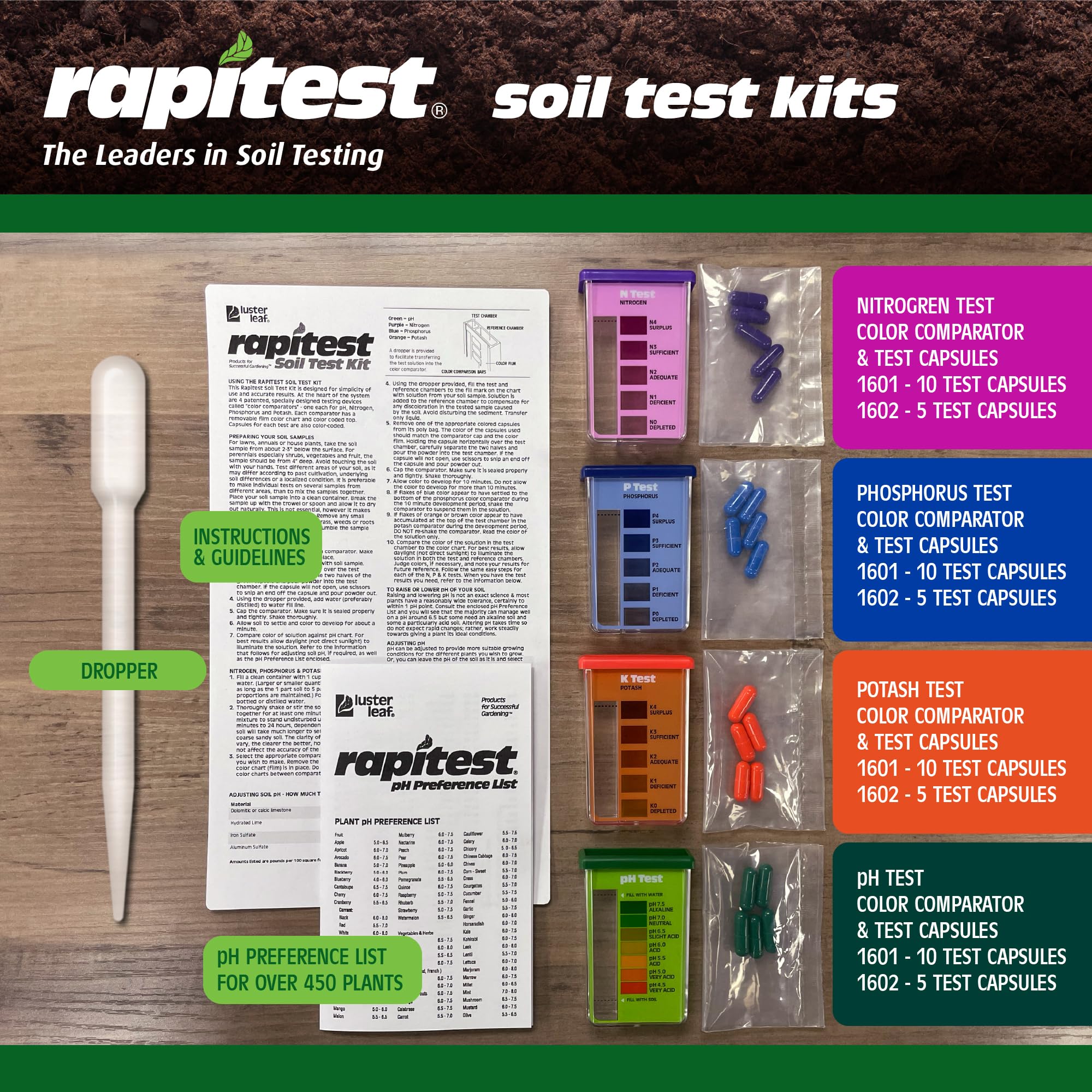 - Quick, at home results for Soil pH, Nitrogen, Phosphorous and Potash Innovative and inexpensive soil test kit features an easy-to-use capsule system and patented color comparators