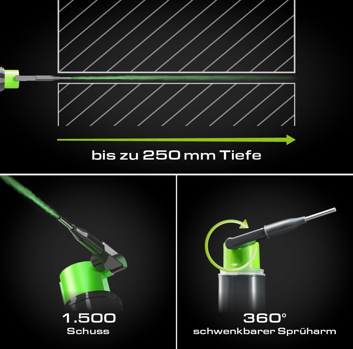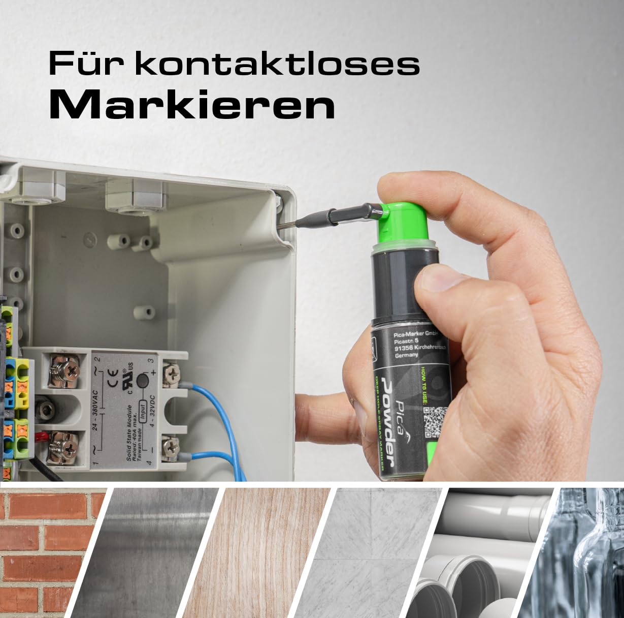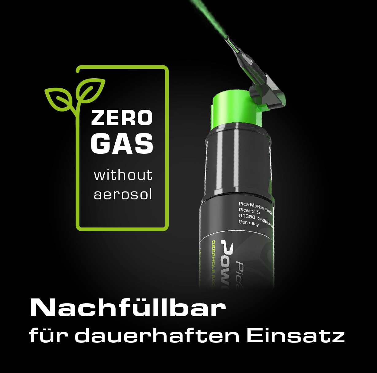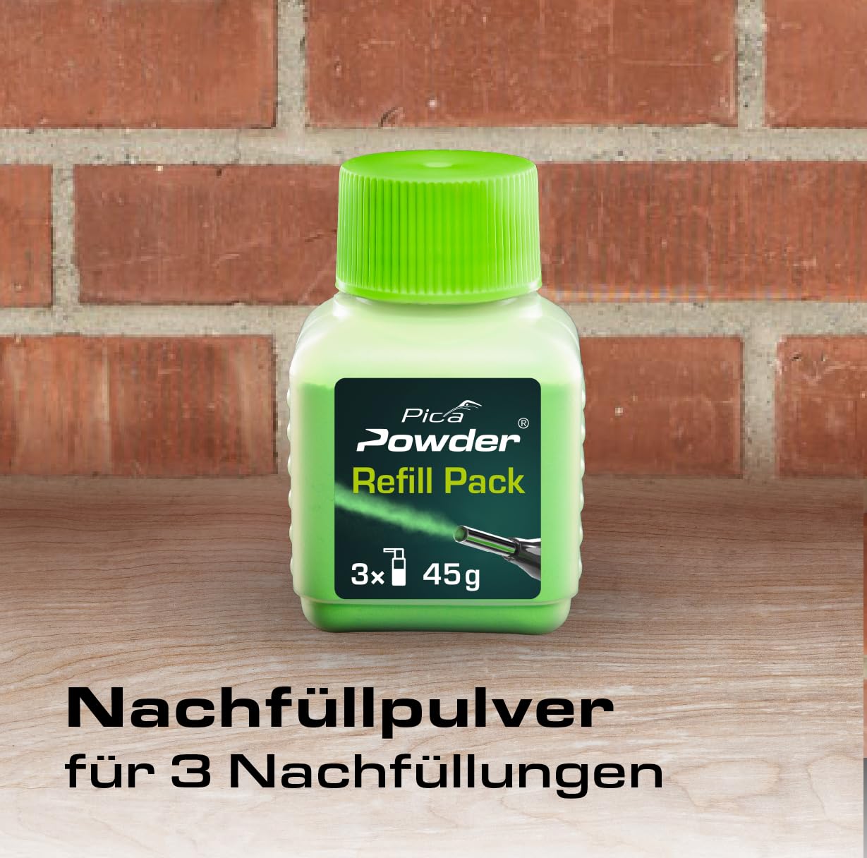 Pica Powder® Deep Hole Spray Marker PICA2020. Holes from 3mm & Marks Through Upto 25cm. High-Vis Green Chalk. Refills for Long-Term use-1500 Shots lifespan. 1 Handed Spray Action. 360° Spray Nozzle.